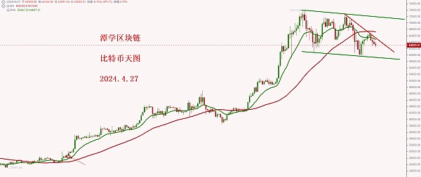 我们再从上面这幅图来看,比特币处于一个旗型震荡区间;同时红色压力线压制着蜡烛图向下轨去做测试。