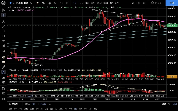大饼昨日整体波动不大,没有延续下跌,晚间行情反弹,最高触及63800一线受阻回落,恭喜跟上低多思路的朋友,目前币价在63680附近运行,四小时级别短期行情止跌走出连阳反弹,macd空头缩量双线粘合有金叉迹象,若站稳63800下个位置关注64500附近,日线级别来看空头未能延续阴线转阳,若能走出连阳则行情企稳,会逐步回升,反之则会试探ma90附近,昨日文中提过下跌没有量能不会有太大空间,做好两手准备,逢低买入为主,有仓位的继续持有,待震荡过后行情势必会拉破新高,上方压制64500-65800,下方支撑63000-62000