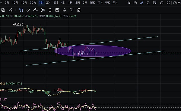 大饼。昨日欧盘饭点小幅插针63200附近快速收回,晚间持续僵持在63500附近一蹶不振,午夜临近64000关口承压回撤,而63900这个位置也是李隆昨晚与部分朋友强调的轻仓补空点。目前小时图来看,相比以太的稳固而言,大饼昨日依旧区间偏窄,早盘连阴格局也并未给到太大突破,BOLL结构相对稳固走平,但附图空间上有所放缓减弱,今日操作上,李隆建议将围绕这两日低点试探性防守,联动以太顺势博多,进场切记做好分批风控计划。