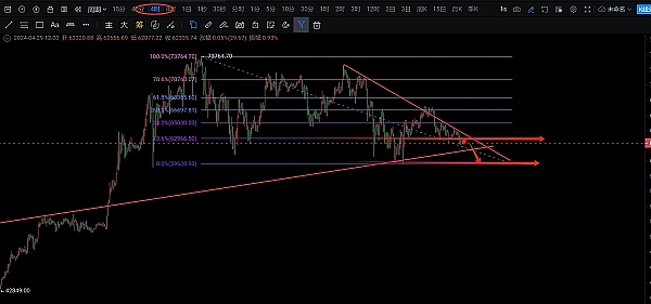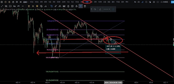 四小时级别来看价格在延伸我们下行趋势线震荡下行,目前价格也是跌破了我们斐波那契23.6,从目前K线的形态来看价格多次触及下行趋势线的压力位形成压制去下跌,那么价格如果再次去触及向下趋势线,也是具备突破上方形成反转,上方63000也是我们目前应该去观察的一个关键点位。