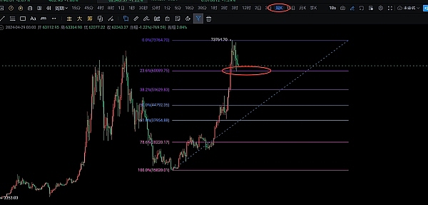 从周线来看目前币价呈现五连阴,那么从我们这一轮的上涨趋势来看,价格从高位72764后价格出现了下跌后,价格是有去试探我们斐波那契23.6也是60000附近,后再次反弹向上后然后空头持续发力。