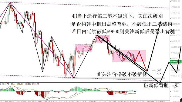 4H级别向下运行本级别下结构,目前关注本级别下的力度,若回落不破新低59600,次级别出现盘整背驰则出二买结构,若强势下破低点59600则关注破低后是否能出背驰走一买。