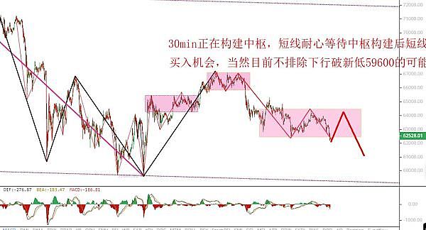 30MIN级别次级别下结构目前正有形成震荡中枢迹象,短期次级别预计震荡后还有次下,当然本次下是否破新低59600还难以判断,不破则4H形成二买结构向上,跌破则关注背驰后再行找机会买入。日内短线思路线空后多。