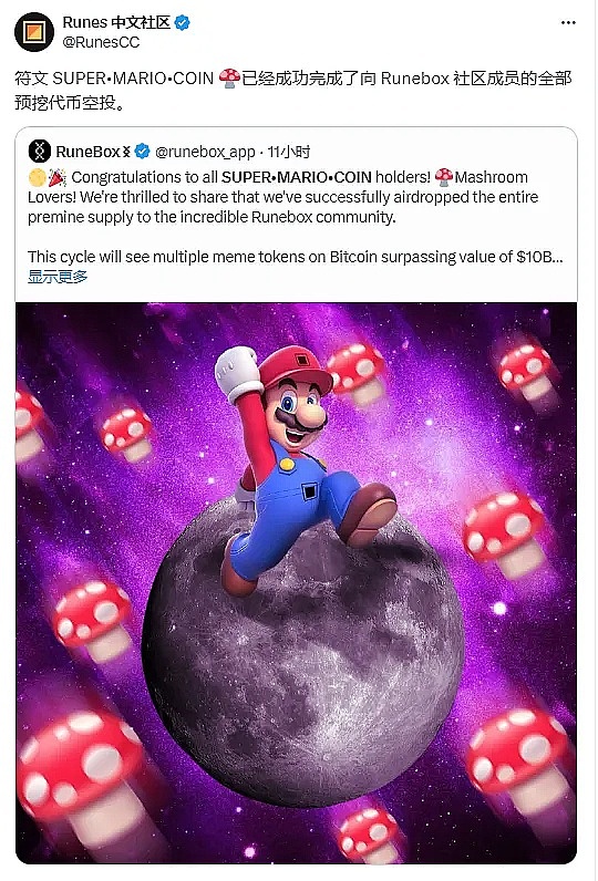 2024年4月28日 RuneBox 发文称符文 SUPER•MARIO•COIN 已经成功完成了向 Runebox 社区成员的全部预挖代币空投。