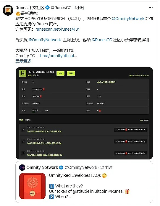 2024年4月28日,OmnityNetwork 主网上线,符文 HOPE•YOU•GET•RICH (#431),将会作为首个 OmnityNetwork 红包应用支持的 Runes 资产。
