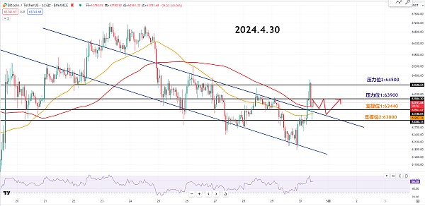 日内第一支撑63440,第二支撑63000。当前的第一支撑在短期内是一个有利的平均价格点,如果价格跌破了第一支撑,那么则有可能会重新形成下降通道。