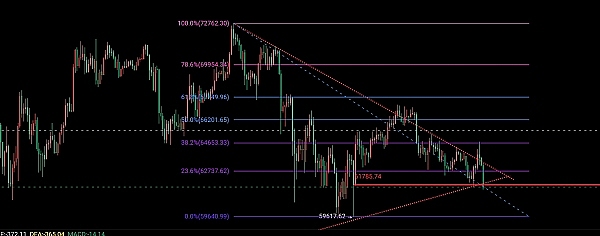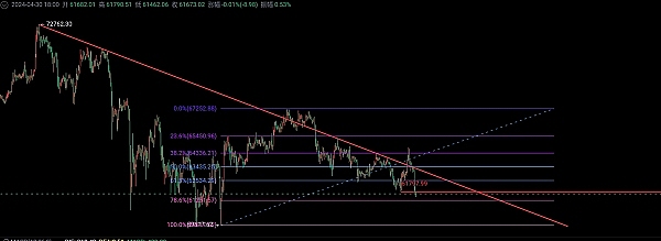 小时级别来看在金日早间价格去突破我们下行趋势线上方后,价格是有去试探上方38.2压力位,后出现了下跌的行情,目前价格是来到了我们下行趋势线下方收了两条实体线,如果价格在我们下个小时收线能够有效去突破上方起稳,那么后市价格是有望再次向上冲击,反至价格如果去跌破我们趋势线下方,那么下方应该去考虑的支撑点位62700以及61700这些位置能不能形成有效支撑。
