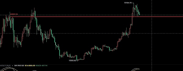 从周线来看目前币价呈现五连阴,那么从我们这一轮的上涨趋势来看,价格从高位72764后价格出现了下跌后,价格是有去试探我们斐波那契23.6也是60000附近,后再次反弹向上后然后空头持续发力。