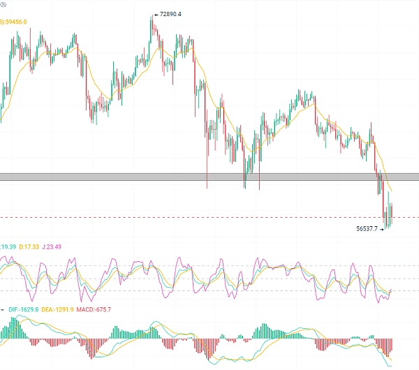 比特币四小时趋势来看,EMA趋势指标向下交替成型,呈现瀑布状态,市场恐慌情绪加剧,EMA15趋势指标跌破60000来到了59500,压力有效可以关注59300上方区间不破可以继续布局,KDJ线上金叉成型以后又向下扳回,KDJ收缩,主力出货明显,MACD缩量增筹DIF和DEA距离拉开,整体趋势偏向回调,短期内有一波多头回调,布林带开口,三线向下低头,下轨支撑来到了55800,中轨关注60500压力点,整体趋势日内不会下跌太多,趋势偏向盘整。