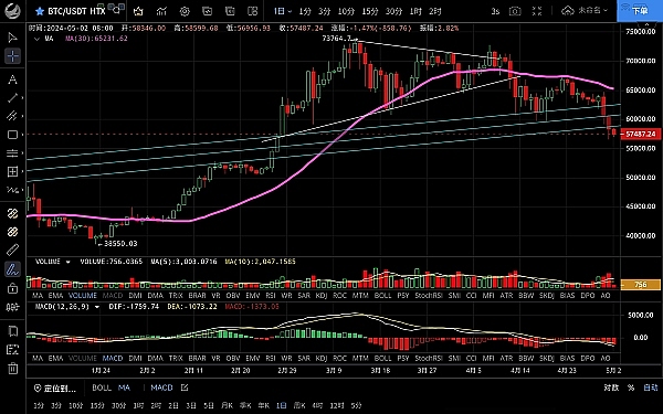 大饼昨日连阴下跌破位新低至56540一线支撑反弹,最高触及59460一线受阻,恭喜跟上低多思路的朋友获利三千余点,目前币价在57560附近运行,四小时级别多次下探都没破新低,短期暂时止跌,底部逐渐抬高,但反弹力度薄弱,macd仍是空头运行双线死叉,受ma7均线压制行情还有下行的可能,日线级别受ma120均线支撑行情向上反弹,但没能站稳再次回落形成上影线,走势来看空头占优,目前56000支撑依然有效,短线还有下跌风险,建议多看少动,长线继续持币,上方压制58500-60000,下方支撑57000-56000