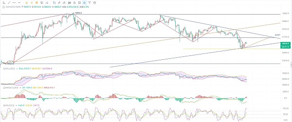 做多第一入场点58800,第二入场点58300补仓多,止损58000跌破就不拿了,不破持有,出场点参考59600和60500两个位置区间,上方趋势转换点在61500附近重点关注,操作上可自由落袋不必太过局限