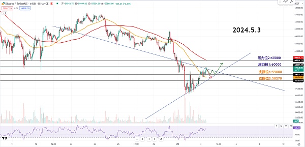 做多第一入场位参考:59000 防守500 目标59800-60000