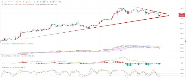 来看今日盘口,截止发稿前比特币现价61800附近,日K线和预测的一样在61500破位以后KDJ形成了金叉,EMA趋势指标60800压力变支撑,上方阻力来到了62500上方,MACD缩量增筹开始上行扩散,DIF和DEA早先的开口扩散开始收缩,布林带整体趋势依旧是空,K线站立下轨支撑59100以后向上拉伸,关注日K线布林带中规压力63400这个位置,趋势上给人不真实的感觉,思路上不变到什么位置做该做的事情就好了,不要被盘口的假象蒙蔽了双眼