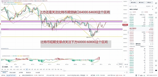既然比特币已经突破了我之前所说的59200上方站稳了之后,那么它的这个67000-59200这个区间已经是打破了就会进入下一个区间走势,今天日内的话上方关注64000-646000,下方关注60800-60000,目前四小时级别图币价运行在布林带上轨进行调整,日内操作思路的话,如果能反弹到64000附近,那么直接空单进场,止损带1000个点:目标看2000-2500个点进行分批止盈。多单可以在61000分批进场,补仓的话再60000进行补仓,止损带在59645