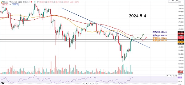 日内第一支撑位在62200,第二支撑位61720。如果价格出现调整,我认为第一支撑是一个适当的调整点。