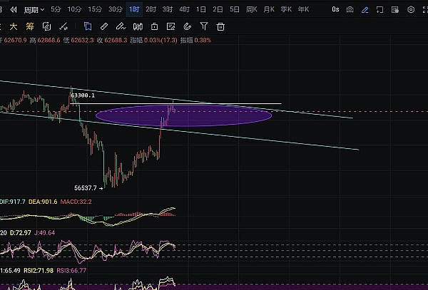 大饼。昨日白盘持续承压6万下方萎靡整理,晚间伴随非农利好烟雾形成反差式拉升,早间更是一举冲高6.3K附近才有所放缓,51前后主力控盘真是毫无章法。目前小时图来看,币价重回中轨上方高位盘整,昨晚至今附图方面持续给到高位粘合死叉迹象,但动能上有所欠缺反复收回,短期筹码区6.3附近持续给到拉扯阶段,而以太方面相比大饼而言超买迹象更为凝重,今日操作上,李隆建议龙头继续关注前期起跌点6.4K的承压防守,稳妥建议在63300上方去分批轻仓空一次,进场切记做好分批风控计划。