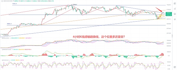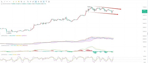 截止发稿前我们可以看到比特币现价63400附近,而周线开盘价63125,目前的盘口处于阴阳交替点附近,周线出现一根很长的下影线,很多币友和交易员都开始看多,币圈院士提醒大家做合约无畏多空,都是机会,不要对着一个方向一直做,可以看到日K线三连阳以后受阻64500刚好是趋势指标EMA30最上方,每次EMA30处于最高点的时候行情都会出现单边,由此可以作为一个参照等待最佳入场时机,KDJ向上开口以后MACD缩量结束开始放量上行,DIF和DEA在62500附近形成金叉,空闲回踩布林带中规63300,短期内可以在62500附近布局短多,又不多的空间可以抓一下