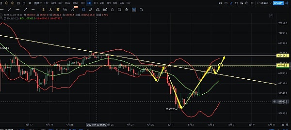 BTC目前突破64500附近压力,多头将继续冲击65423附近水平压制,4小时呈一个上升三角形态,又呈头肩底形态,日线呈阳三兵走势上行,目前已站稳布林带中轨,后市突破64500颈线压力64500上方看到65423!