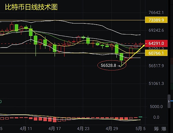比特币行情分析:亚盘承压下行,欧盘震荡走高,美盘延续涨势,整体波幅不大,相对来说维持震荡上行格局。日线连续四连阳,尤其是在站稳60000美元大关之后,多头强势反攻直指65000美元关口。若是币价突破并站稳于此,那么后市将进一步看向68000美元关口附近,若是承压的话,短周期内将继续维持三角形区域震荡。四小时上看币价于56500美元一带展开反抽之后,多头并没有过多的回调,相反在一段行情调整中爆发,币价亦是沿着两大均线于BOLL上轨上行。短期上方重点关注66000美元一带阻力,下方则重点关注62500美元一带支撑情况。技术面上看币价趋势的转变已经倾向于多头,对于其操作上我们应该保持顺势主多辅空思路,对于凌晨阶段重点关注63000-65500美元区间。