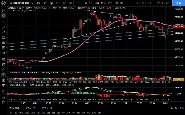 大饼昨日早间最低回踩至62890一线支撑,白盘行情一路反弹上行最高触及64635一线受阻,恭喜跟上低多思路的朋友,目前币价在63800附近运行,四小时级别价格突破前高却未能站稳走出回落,macd形成顶背离结构,量能逐步缩减有高位死叉迹象,短期多头滞涨,行情还有回踩空间,日线连续四日收阳,目前临近上方压力,只有站稳64500才能延续上行,反之会先走回落,指标信号偏向多头,预计回落力度不会太大,思路建议依旧保持低多为主,上方压制64500-65800,下方支撑63300-62500