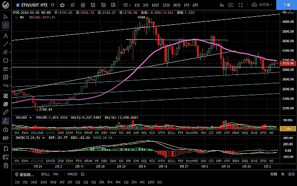 以太坊昨日最低回踩至3072一线止跌反弹,k线连阳多头拉升最高至3170一线受阻,恭喜跟上低多思路的朋友,目前币价在3132附近运行,四小时级别k线收上影且走出连阴,macd多头缩量双线粘合有死叉迹象,多头暂时滞涨有回踩需求,下方关注3100支撑情况,若能守住则还有突破前高的可能,日线来看k线连阳碎步上涨,可见多头较为强烈,短期在3130附近震荡吸筹,个人预计后续有一波冲高的机会,思路建议逢低做多为主,上方压制3170-3230,下方支撑3100-3050