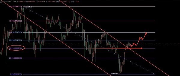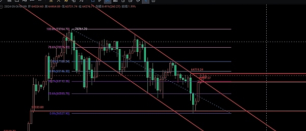 四小时级别中K线是存在下行通道运行,在上周六价格去向上突破我们通道,后出现多次向下试探下方底部支撑,但是并没有有效的继续向上去突破,从斐波那契来看目前价格是处于38.2上方运行,如果63000附近能够形成有效支撑,那么后期价格向上突破的概率是很大的,上方需要去关注65000压力位。
