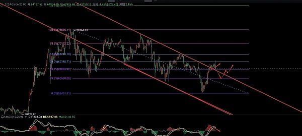 四小时级别中K线是存在下行通道运行,在上周六价格去向上突破我们通道,后出现多次向下试探下方底部支撑后去向上突破上方65500一线,但是并未起稳出现了下跌,从附图指标中MACD出现了背离,我们坑定是不会放过这段行情,当时是在直播中也是给到了64000的现价空单(不明白的可以去么币看我直播回放),价格目前以及走出了下跌,那么后期我们该考虑在下方支持位置去选择我们多头的布局,或者说是考虑价格反弹上去依旧可以去短空的思路。