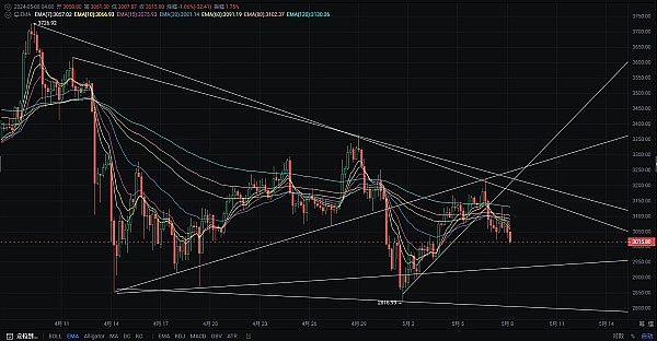 日线级别来看,币价从前日的EMA60处不断向下穿过各均线,今早间更是来到EAM120均线下方,大家可以查阅我前日就有说到币价已经4连阳,上方并没有太大空间,于是就在3195上方开始布局空了;再看KDJ三线交叉后继续向下扩散,MACD中0轴上方能量大幅缩量,DIF与DEA间距不断收口即将形成死叉,这也是利空信号,一旦形成,那么币价将继续维持多日的一个空头延续!综合上述指标可继续保持高空操作即可!目标关注2-3日低点区间;