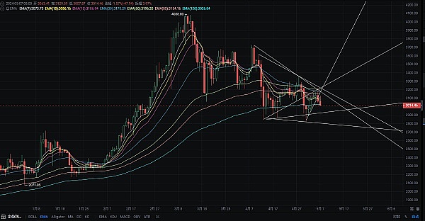 4小时来看,K线在昨早间回撤到3024后再次反弹至3130处,也就是在冲击EMA120均线未果后再次大幅回撤,和预期高空布局完美契合;再看当前币价正在接近3000关口,KDJ在底部拐头并未成功继续向下扩散,MACD下方能量持续增强,DIF背离DEA也正式走入负值状态;历辉多次说过昨日这波拉伸很明显的是吸多头,尤其是在指标没有明显的止跌信号主力还在不断放利好消息,所以就一定要谨慎!这也是g庄一贯的诱多操作!