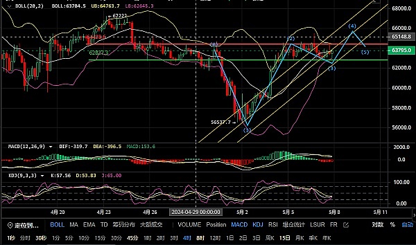 昨日比特币自62685企稳后强势上扬,晚间一度触及64418高位。日线图上,小阳线收盘,显示上涨趋势依旧。四小时图上,BOLL指数贴近上轨运行,MACD红柱虽缩量,但DJ三线有望形成金叉,MA7、MA30均线指引向上。从技术面看,多头仍占主导,短期可考虑回调至63500-63000区间做多。