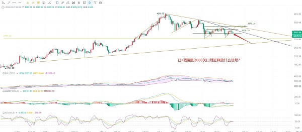 来看目前的盘口,日K线已经跌破了EMA趋势指标120,KDJ向下交替被反向扳回上行连续的转变多空在3030支撑附近来回洗盘,MACD也在区间放量缩量来回变换,DIF和DEA已经在低位出现了5次交替,布林带收缩,K线冲击中轨3130失败回落,能否回踩支撑2960?