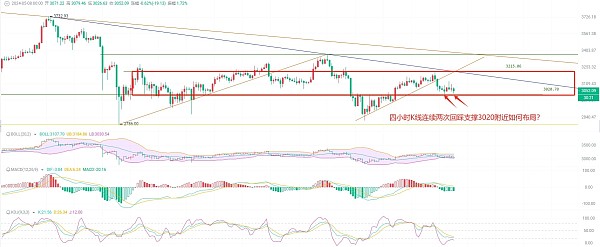 四小时K线跌破EMA趋势指标,K线连续出现很长的上影线,KDJ上行收口受阻3130,MACD缩量增筹失败,DIF跌入0轴下方,DEA还在0轴之上,这种两极分化导致的趋势就是横盘,加上布林带收缩以后K线在3110和3030区间横盘,整体趋势可以关注下方3000整数关口的变化布局,顺势操作最稳健