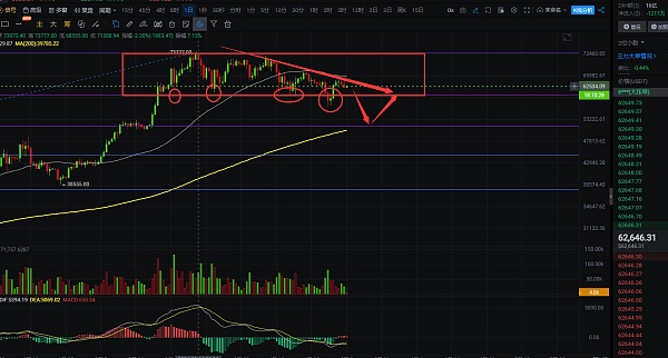 日线图上看,大在前面反弹到73777位置后,一直处于高位走箱体震荡,60000支撑几次试探都没有被有效跌破,但前面的下跌是打破了60000支撑,最低下跌点位在56552位置,随后走出反弹,反弹到65500后又收上影线开始回调,目前大饼已经形成下跌趋势了,65500是前面下跌到56552后反弹的压力位,刚好到达压力后开始走下跌,随后的下跌很大机会是会跌破56552位置,预计下个低点在52500附近,目前下跌还在继续,白盘短线下跌也还没有到位,短线上大饼这波下跌支撑区间在60000-58500,到达58500后就需要关注56552破位了,空头强势继续下跌,跌破56552位置,下个目标就是52500附近了,近期交易上高空思路去做,白盘推荐点位63400附近,下跌区间就是60000-58500,到达后再关注低点破位情况,自行把握进场机会;短线交易,控制风险,盈亏自理;