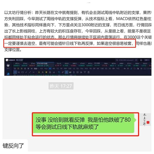 以太坊行情分析:以太坊昨天多次测试周线中轨附近的支撑,一直震荡运行,晚盘插针日线下轨支撑反弹,从周线来看,行情在这波4095高点回踩后,多次去测试了周线中轨的支撑反弹,而随着周线中轨的抬高,可以看出若是本周不能顺利突破,那么下周可能会处于周线中轨下方开盘,这样的话,周线中轨就成为了压制位,上方5/10均也是处于拐头向下的走势,若是刺破了中轨,那么行情将会继续下跌,日线方面行情三飞乌鸦,连续三天走阴,触及下轨反弹,MACD方面量能并不充足,现在处于关键位置,多空争夺激烈,会继续震荡运行,可关注日线下轨的支撑,不破还是有机会反弹。