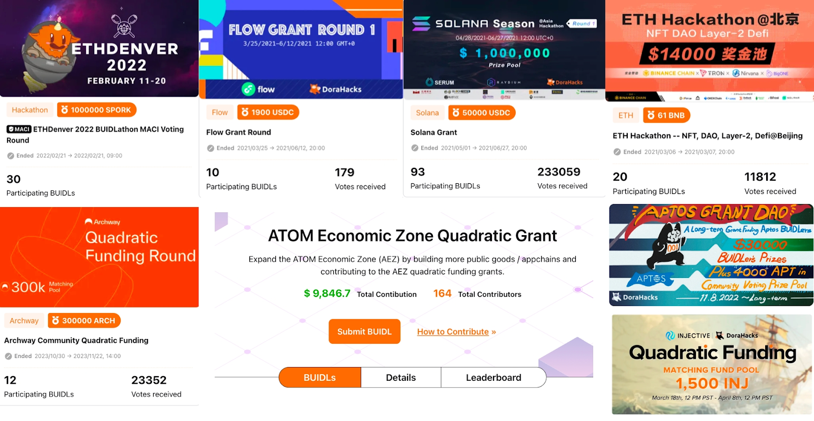 此后,DoraHacks团队不断在多链世界中推广二次方治理,并在Solana、Aptos、TON、Cosmos Hub、Injective、Archway、Flow等主流非EVM链上成功应用。2022年,在ETHDenver BUIDLathon上,DoraHacks支持了规模空前的线下二次方投票活动,并在随后的线上BUIDLathon中继续扩大了全球社区的参与。目前,作为支持生态最多的二次方治理平台与基建,DoraHacks已支持了32个Web3生态进行链上二次方资助,总计超过30万社区成员参与其中。
