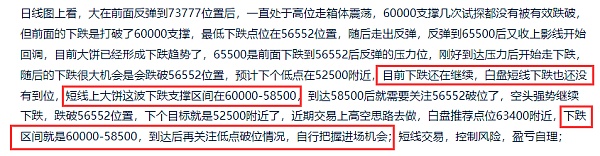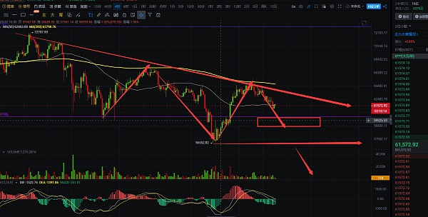 4小时线上看,大饼如预期走出下跌,大饼还未到达短线下跌支撑区间,这波区间依旧是60000-58500,到达这个区间再根据58500附近收线情况,看有没有反弹机会,如果空头继续走强,那下方的56552位置基本上是守不住的,跌破后下方到达的位置就是52500附近了,白盘交易,依旧是做空为主,昨日有空单或者高位空的继续持有到60000-58500区间,没有空单的,白盘推荐点位是62100附近布局,目标不变,自行把握进场机会;短线交易,控制风险,盈亏自理;