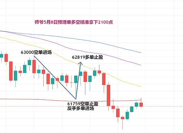 日内第一支撑在60230,第二支撑在59000。从短期来看,师爷会将第一支撑视为低点,所以短线交易可以在第一支撑附近尝试短期反弹。如果跌破第一支撑的话下方空间将进一步打开,中线空头目标师爷会下看至59000。