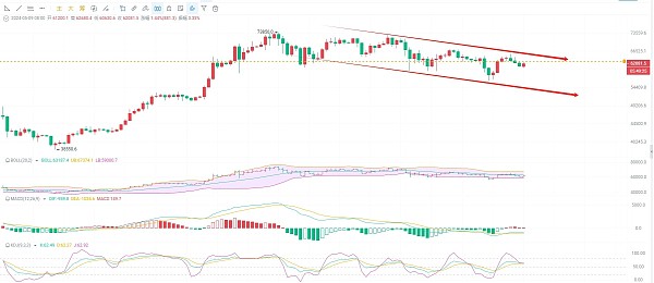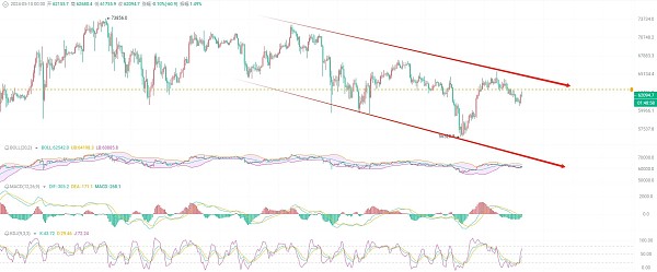 截止发稿前比特币现价62000附近,日K线虚破EMA趋势指标90的支撑61000,最低到了60600附近,连续两天日K线支撑点都在61000趋势指标位,那就说明这个位置支撑有效,KDJ向内收口受阻,有可能扳回上行吗?MACD放量增筹上行,DIF和DEA原本的空势变成了向上扩散,布林带中规压力位在63100,下轨的支撑在59000,整体趋势上有比较浓厚的空势,这个时候扳回受阻61000大概率横盘修复,上方不破63300多头就不会开加上周末出现的横盘,