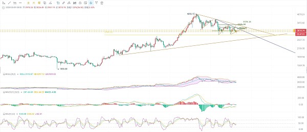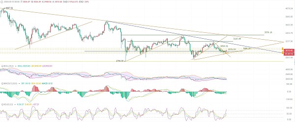 四小时K线表现的更明显一些,连续收阳线回到了EMA趋势指标也顺利破了3000关口,在整数关口附近盘整,站稳以后上方预计还会进一步上探压力位3100附近的态度,尤其是KDJ向上开口的趋势和MACD缩量增筹导致DIF和DEA收口形成的金叉,现在K线开始冲击布林带中规压力3025,破了可以顺势多有一波超短利润可以收一波