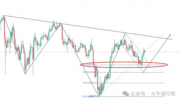 4小时这是一段空头结构,但我更倾向于把它理解为震荡结构,不同的处理方式,带来的交易逻辑不一样,可能走头肩底部。着重关注下方的几个重要支撑,但是注意,没有止跌反转接小时级别的多头排列,不确认支撑。只做看到的行情,不做猜测的行情。上有强压,下有支撑,多空博弈还在继续,目前双方还是没能出现绝对优势,近日依然是震荡为主,还得继续保持耐心,等待最终的胜利者出现。至于布局上,现货之前59000的布局继续耐心持有即可,短线合约方面这里就不做过多的阐述,以社裙实时为主,多空都有空间,看你如何把握。