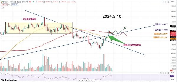 日内第一阻力位在63250,第二阻力位在64000。如果价格接近了第一阻力附近,那么师爷认为目前已稳定在上涨趋势线之上,就可以将63000设为支撑,然后可以继续保持看多的思路。