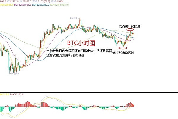 5月10日比特币(BTC)合约技术面分析:今日方面,大周期日线级别昨日报收小阳线,K线形态连阴单阳,附图指标虽说金叉运行,但延续性和力度都不是很明显,主要是以震荡区间为主,且价格被压制还是比较明显的,那么交易我们就要注意,尽量还是短线为主,切莫盲目的扛单;短周期小时图昨日价格欧美盘上涨凌晨延续破位前一日高点,早间承压出现回撤,高点63450区域附近,当前K线形态连阴单阳,价格出现回撤,附图指标多头缩量运行,那么日内价格大概率是有回撤走势的,但还是要关注欧盘的力度和延续问题;因此今日BTC短线合约交易策略:现价62950区域直接空,止损63300区域,目标看62250-62000区域;
