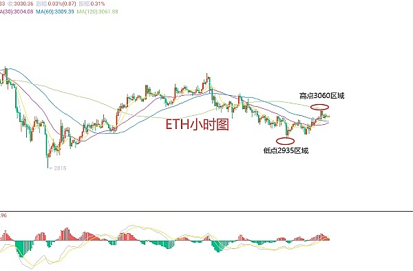 5月10日以太坊(ETH)合约技术面分析:今日方面,大周期日线级别昨日报收小阳线,K线形态连阴单阳,价格在均线下方,附图指标金叉死叉快速转换,走了时间换空间的走势,那么当前来说整体走势在区间震荡内,交易上大家就一定要采用短线,等待周期会长,价格波动不会很大,所以长期持有没有好处;短周期小时图前一日价格在欧美盘上涨凌晨和早间延续破高,当前承压回撤,高点3060区域附近,K线形态连阴,这样来看日内大概率还是要跌的,至于力度还是关注欧盘时间,因此今日ETH短线合约交易策略:现价3032区域直接空,止损3060区域,目标看2980-2960区域