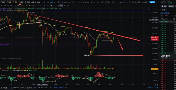 4小时线上看,大饼短线虽然走出反弹,但并未打破下跌趋势线,行情也是在200日均线下方运行,目前还未走出破位,短线上方是有很大压力,虽然昨日的推荐点位被扫,但并不代表行情就持续反弹,反弹是为了更好的下跌,前面跌破60000支撑位就说明市场属于空头强势,后续的反弹也并未打破67232短线高点就开始下跌,现在的小反弹也只是下跌过程中的小幅反弹而已,行情走单边的机会很小,大多时间都是涨跌震荡位置,后市短线依旧是看好下跌,预计区间依旧是60000-58500,白盘推荐点位,63500附近,目标区间依旧是60000-58500,只要不突破65500,空间就基本安全,自行把握进场机会;短线交易,控制风险,盈亏自理;