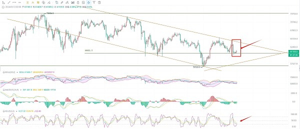 做多入场点参考60800到61000区间布局,目标看61500到62100区间,破位看63000附近(U型过度压力位附近),止损400点