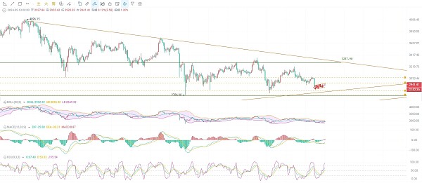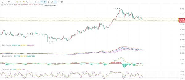 来看今日目前的盘口,截止发稿前依旧是凌晨两点,以太坊现价来到了2940日K线周末连续盘整在底部磨心态,这样的趋势出现过很多次,EMA趋势指标底部筑基,EMA整体开始向下网状扩散,KDJ向下收口2880以后开始收缩,MACD缩量也开始增筹,说明主力动力开始增强,DIF和DEA低位收口,布林带中规支撑关注3070附近的压力,支撑关注2865附近,
