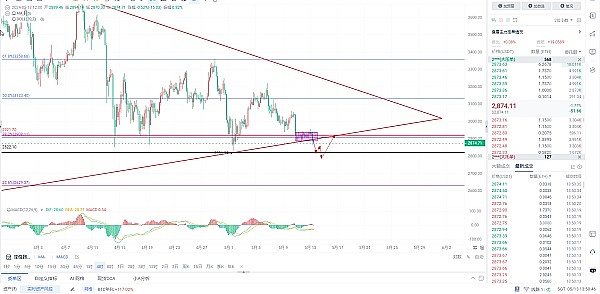 以太坊下方关注2800:短期关注2920,日内操作先下后上的机率比较大,可以在2800-2780挂一个多单,如果能触发,后市反弹力度较好的话,可以看2900上方
