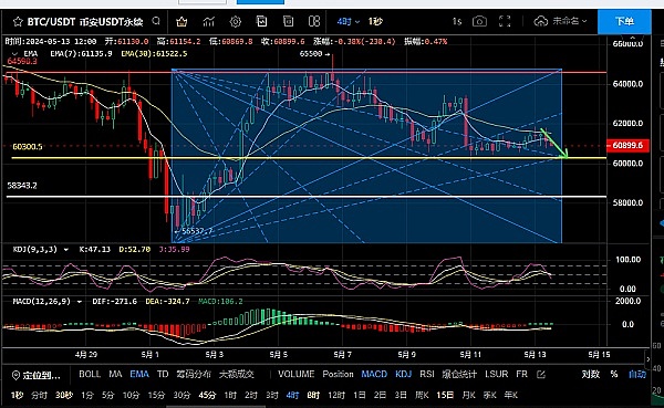 比特币大周期日线级别5月10日出现了明显的长阴线,随后几天虽有反弹但涨幅有限,整体趋势偏向横盘震荡下行态势。近期,4小时K线显示价格波动较大,出现了一些下跌的迹象。特别是在05月13日00:00至12:00之间,价格从高点61849.4逐渐回落至60924。BOLL指数在中轨附近运行,附图MACD技术指标中,DIF和DEA均为负值且MACD柱状线呈缩小趋势,短期内市场可能存在继续下行的压力。KDJ指标显示J值在最新的数据中低于K值和D值,这通常被视为卖出信号,暗示市场可能进一步走软。4小时级别成交量在5月10日20:00达到峰值后开始逐渐减少,市场参与度不高。从技术指标分析,短期交易策略维持反弹高空为主。