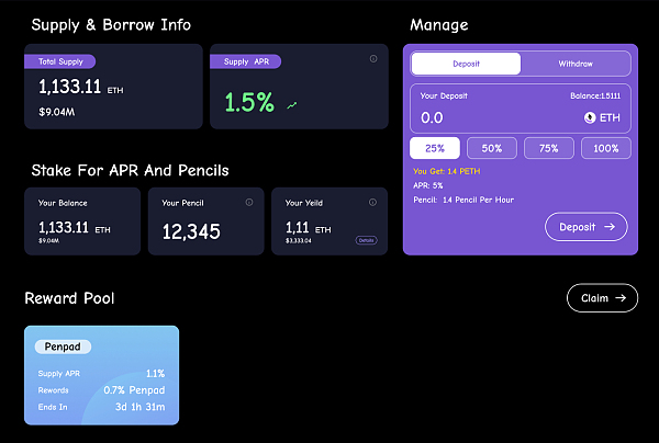 从支持的资产类型上不难发现,Pencils Protocol 一方面通过对以太坊、比特币生态的支持,其能够与这些蕴含巨大价值的生态建立深度的链接,也就是说 Staking 板块是 Pencils Protocol 生态与以太坊、比特币生态建立链接的一个重要管道,丰富的结构化产品以及可观的 APR 收益,有望将以太坊生态中的各类优质资产迁移至 Pencils Protocol 中,并推动 Pencils Protocol 生态 TVL 的迅速规模化,并对 Pencils Protocol 生态进行反哺。
