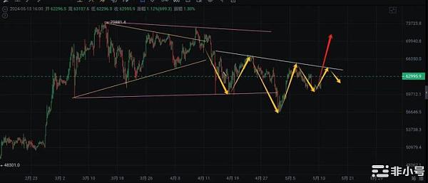在分析比特币的技术面,我们注意到5月1日的最低点56552,这个数字标志着这一轮调整的底部。